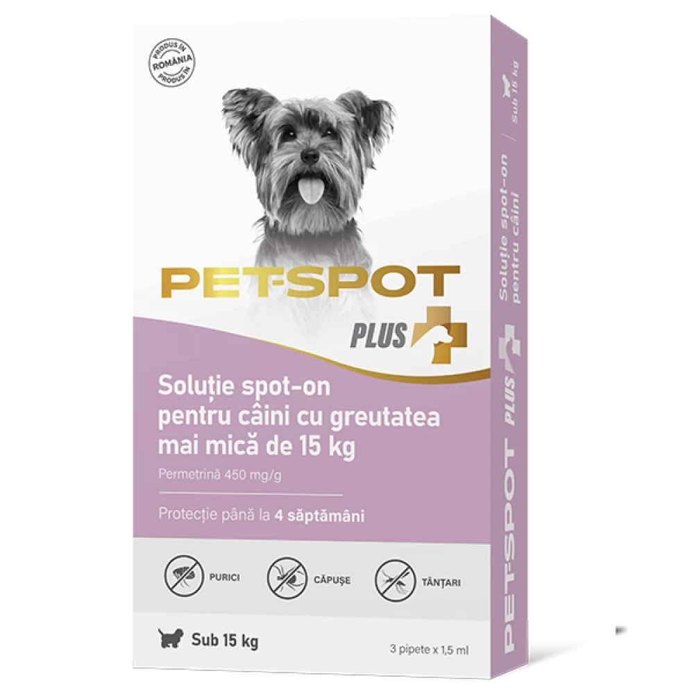 3 Pipete Pet Spot Plus Câine Talie Mică (<15 kg) – Antiparazitar cu Permetrină | Protecție Purici, Căpușe și Țânțari