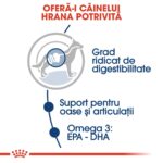Formula oferă digestibilitate ridicată, susținând digestia sănătoasă și echilibrul florei intestinale. Conținutul adaptat de nutrienți ajută la menținerea sănătății oaselor și articulațiilor, esențială pentru câinii de talie mare, activi sau sedentari.