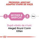 Royal Canin Mother & Babycat este o hrană completă special formulată pentru pisoi aflați în prima etapă de creștere (1–4 luni), precum și pentru femelele adulte în ultima etapă de gestație și pe întreaga perioadă a lactației. Rețeta susține imunitatea, digestia sigură și dezvoltarea cerebrală timpurie.
