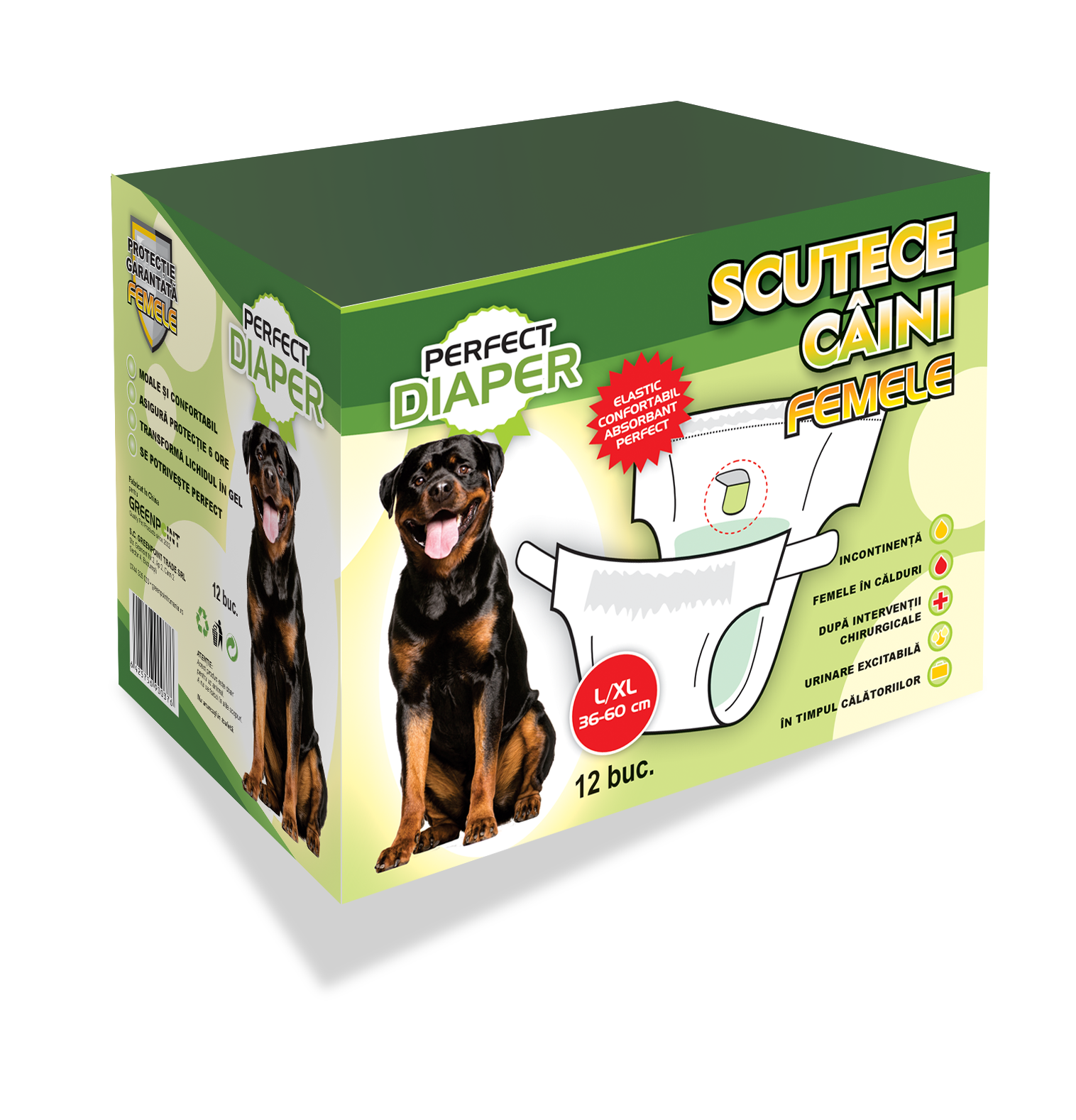 Perfect Diaper este un scutec de unică folosință concepute specia pentru anatomia canină, recomandat în cazuri de: